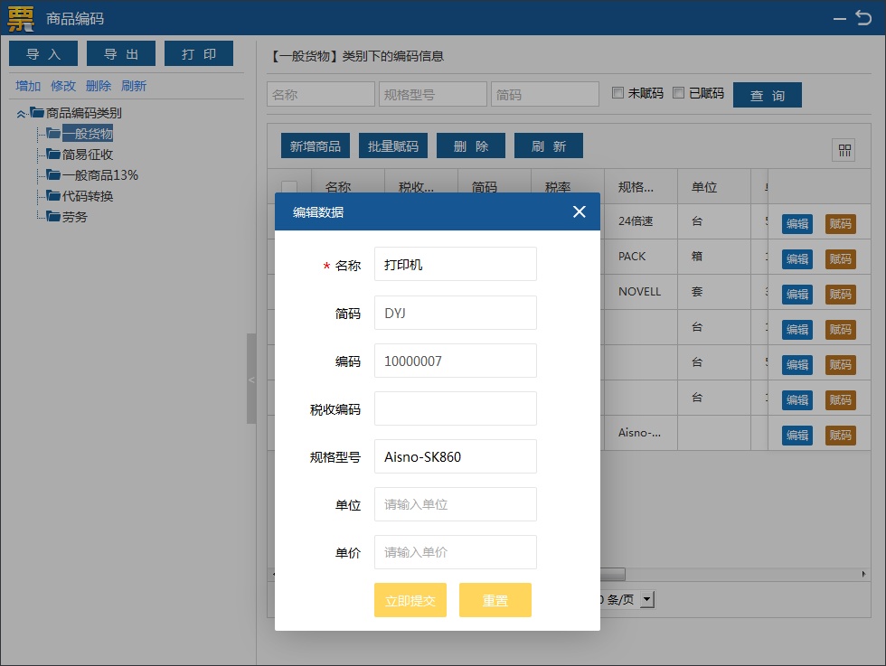 (1)点击【自定义货物与劳务编码】进入编码设置界面,选择商品编码类别后录入商品信息,点击【立即提交】保存商品编码。