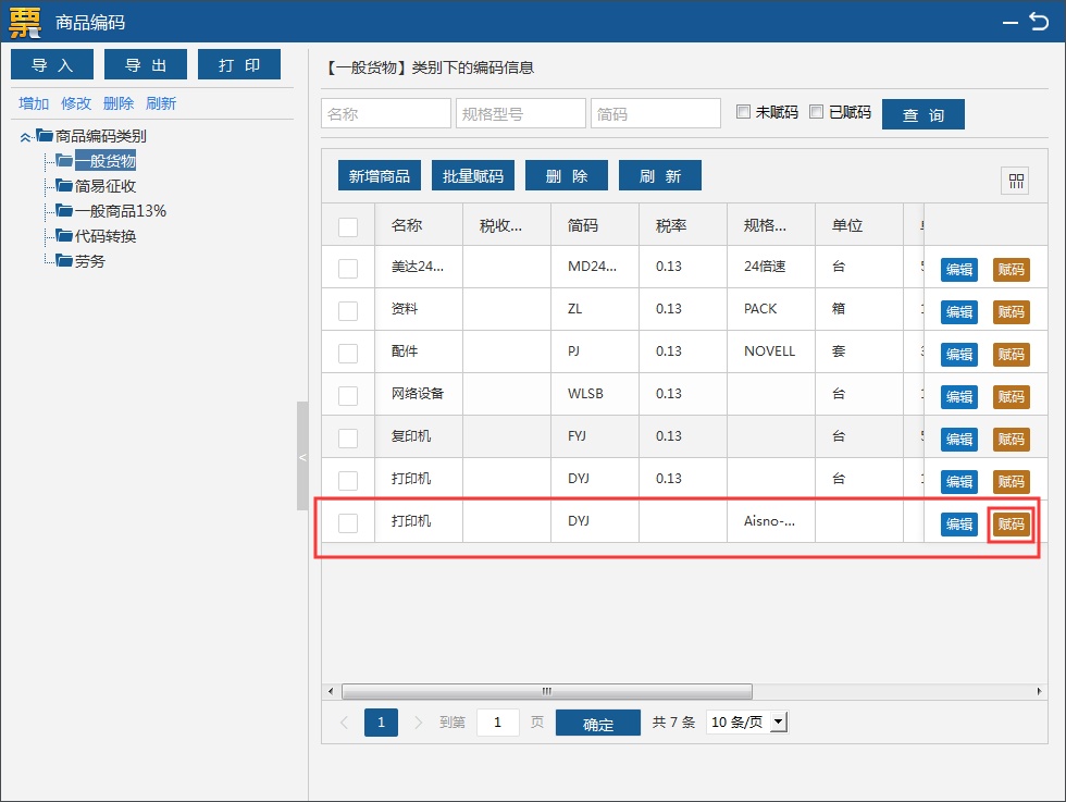 (2)选择商品,点击【赋码】进入税收分类编码设置界面。