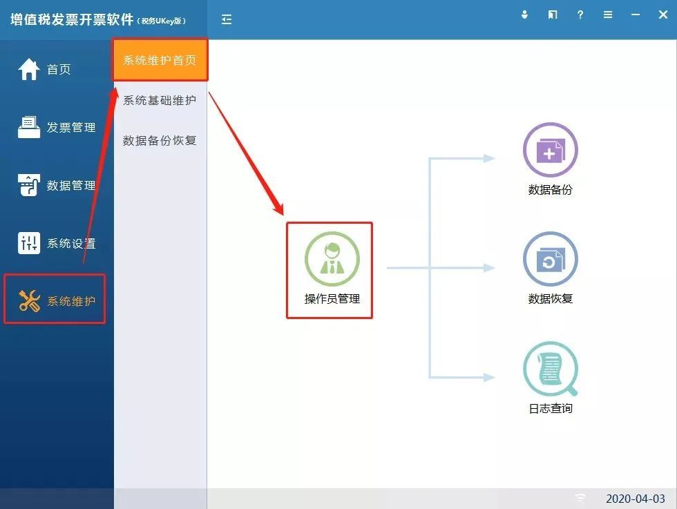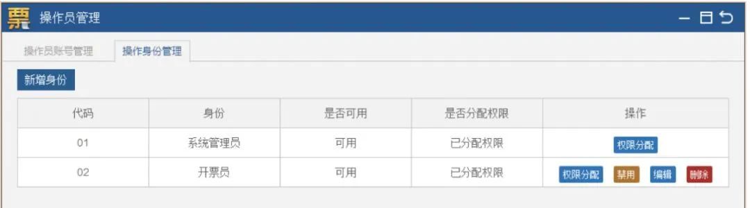 管理员身份登录开票软件,点击【系统维护】-【系统维护首页】-【操作员管理】,点击【操作身份管理】,查看是否有【02开票员】。