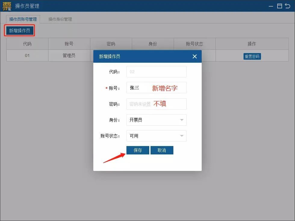 (1)如果有【02开票员】,点击操作员账号管理选项卡,点击【新增操作员】,输入开票员信息,身份选择【开票员】,点击【保存】。
