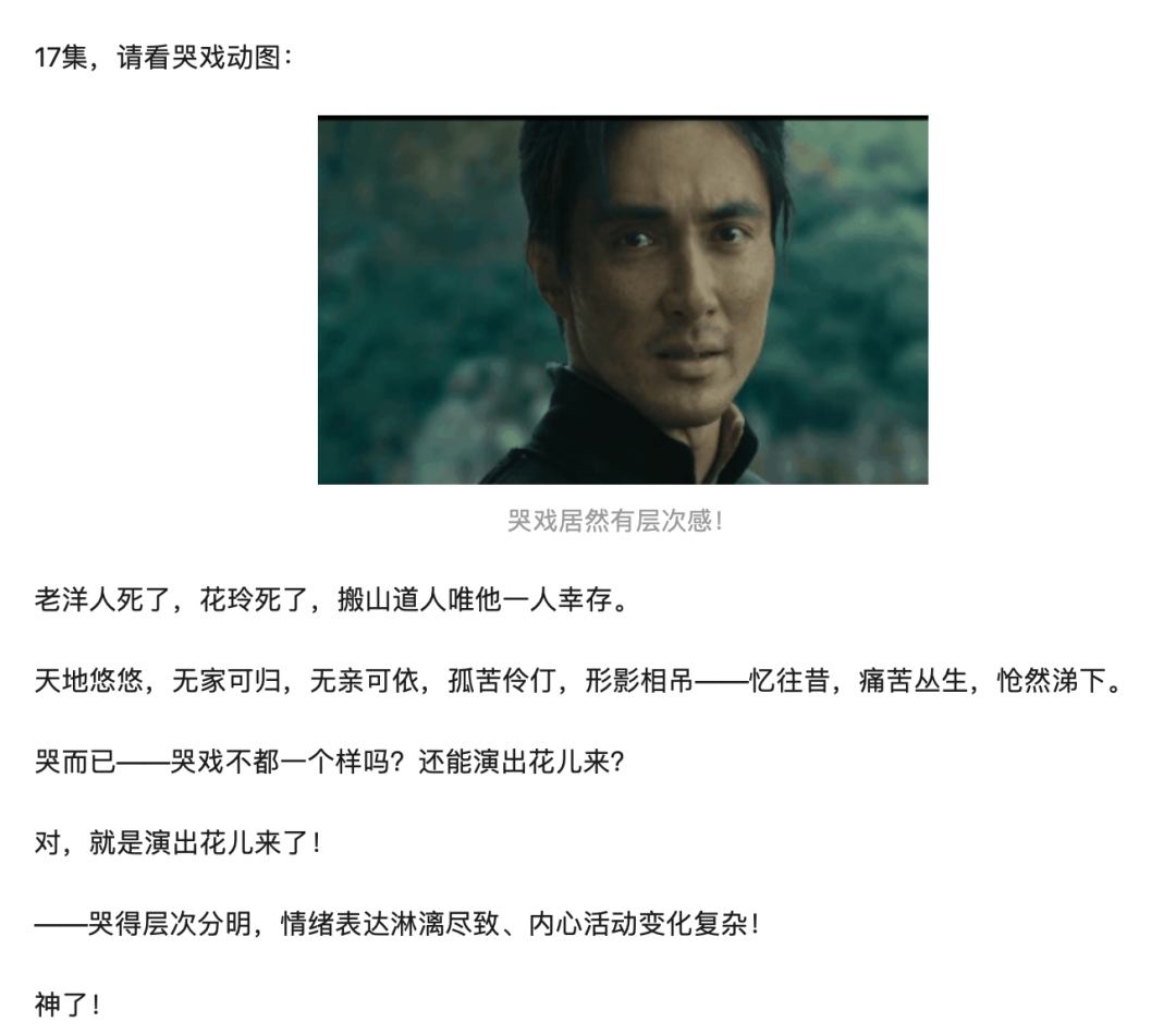 比方说,一个特写眼神,导演既然只拍眼睛特写,那么这一刻他就需要这个特写,只要把眼神给到了,不管你当时在想什么,观众肯定是顺着剧情去推动的,那么这个眼神就符合当下的剧情发展,这是技术方面。