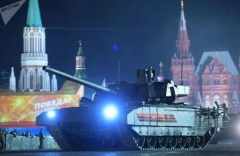 俄罗斯卫国战争胜利73周年红场阅兵彩排中的T-14坦克(俄罗斯卫星通讯社)