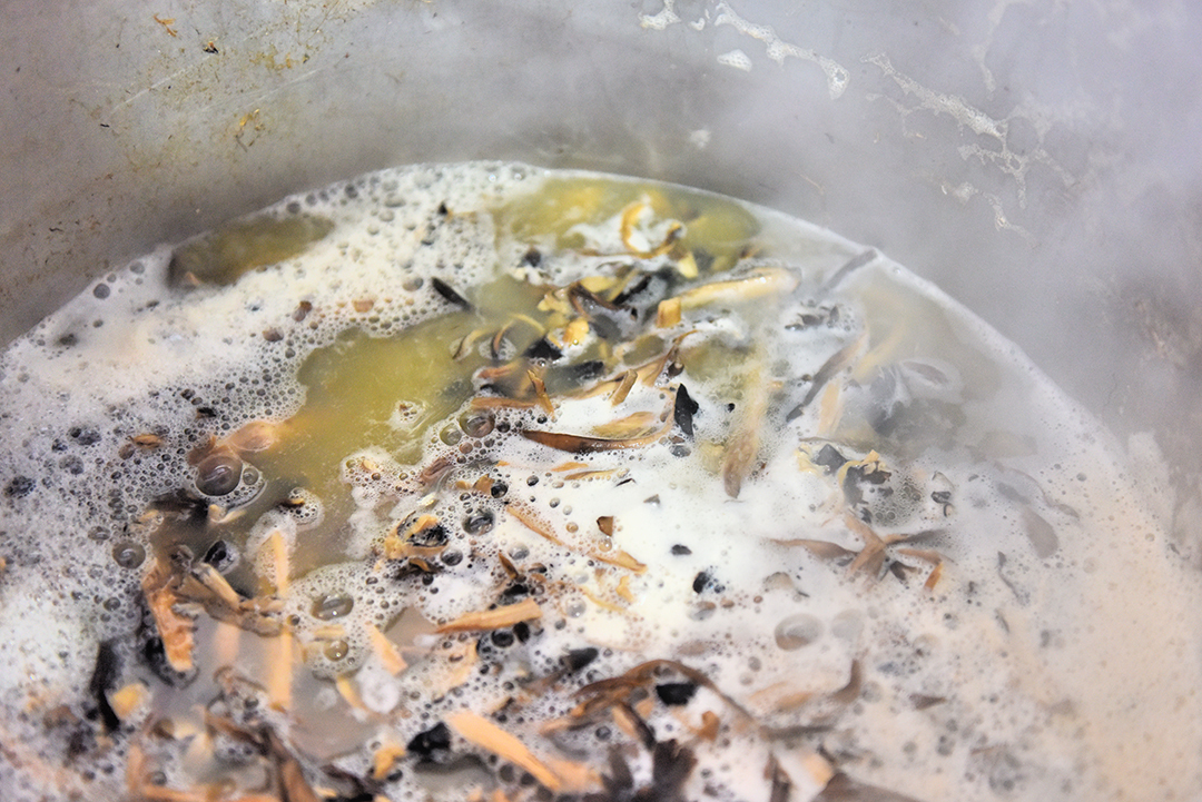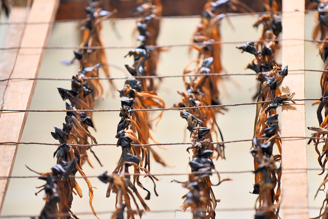 “洗去土,量以盐煮烘干……”最原始的保存方法,是干鸡枞。其制作方法,就是把鸡枞去土后洗净,加上适量盐煮一次,然后在太阳下或者用传统的柴火余炭烘干,也可以在大铁锅里用余火焙干。做干鸡枞,一般都要选用刚出土的黑鸡枞小骨朵,这样制作出来的才耐存储,保证口感。