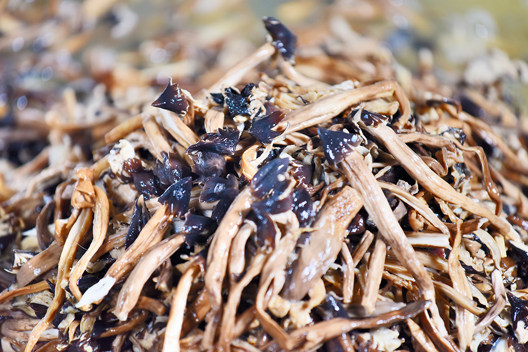需要吃时,只需要取出干鸡枞,用温水泡“醒”后,直接用被称为鸡蛋果的树番茄加相关调料凉拌了吃,也可以煮汤、炖鸡蛋等。吃起来虽然没有鲜鸡枞那般鲜香,却特别有嚼劲,别有一番风味。