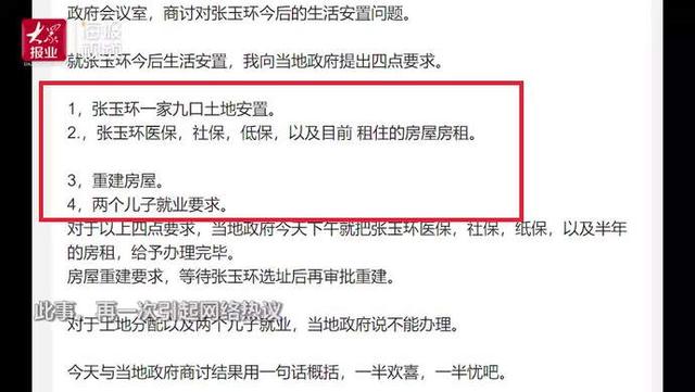 近日,张玉环的哥哥张民强在微博发文,就张玉环今后生活的安置,向当地政府提出了四点要求:“张玉环一家九口土地安置;张玉环医保,社保,低保,以及目前 租住的房屋房租;重建房屋;两个儿子就业要求。”此事引起网络热议。