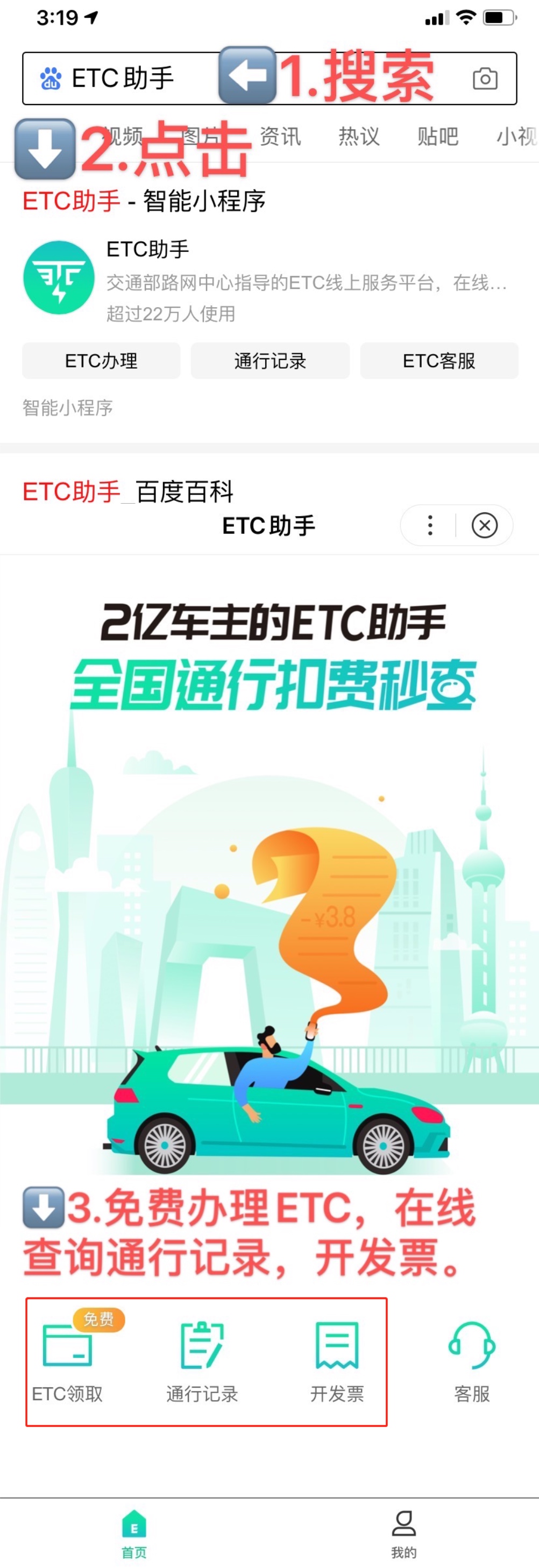 按照下方提示在百度搜『ETC助手』 可免费查询ETC通行记录 开发票噢~