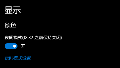 切换到夜间模式,屏幕色温会变低,可以动态地看到屏幕色调从冷色逐渐过渡到暖色。除了手动打开夜间模式,Windows 也提供了自动切换到夜间模式的选项,打开系统设置--显示,启用夜间模式,系统会在18:38之后自动开启夜间模式。