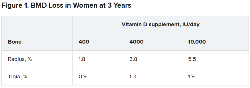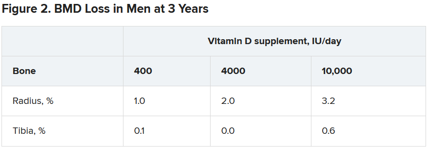 研究发现,与400IU相比,4000IU或10000IU的治疗导致女性的TtBMD丢失,但男性中这一现象并不显著。