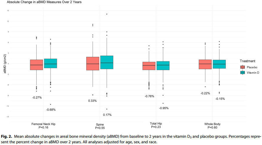 图3 VITAL研究:与安慰剂相比,一般健康成年人2年补充维生素D3并没有改善骨密度
