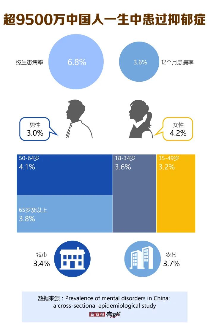 调查显示,抑郁症的终生患病率(在一生当中得过抑郁症的患者所占总人口比率)为6.8%,12个月患病率(12个月内得过抑郁症的患者所占总人口比率)为3.6%。照此计算,超过9500万中国人一生当中得过抑郁症。