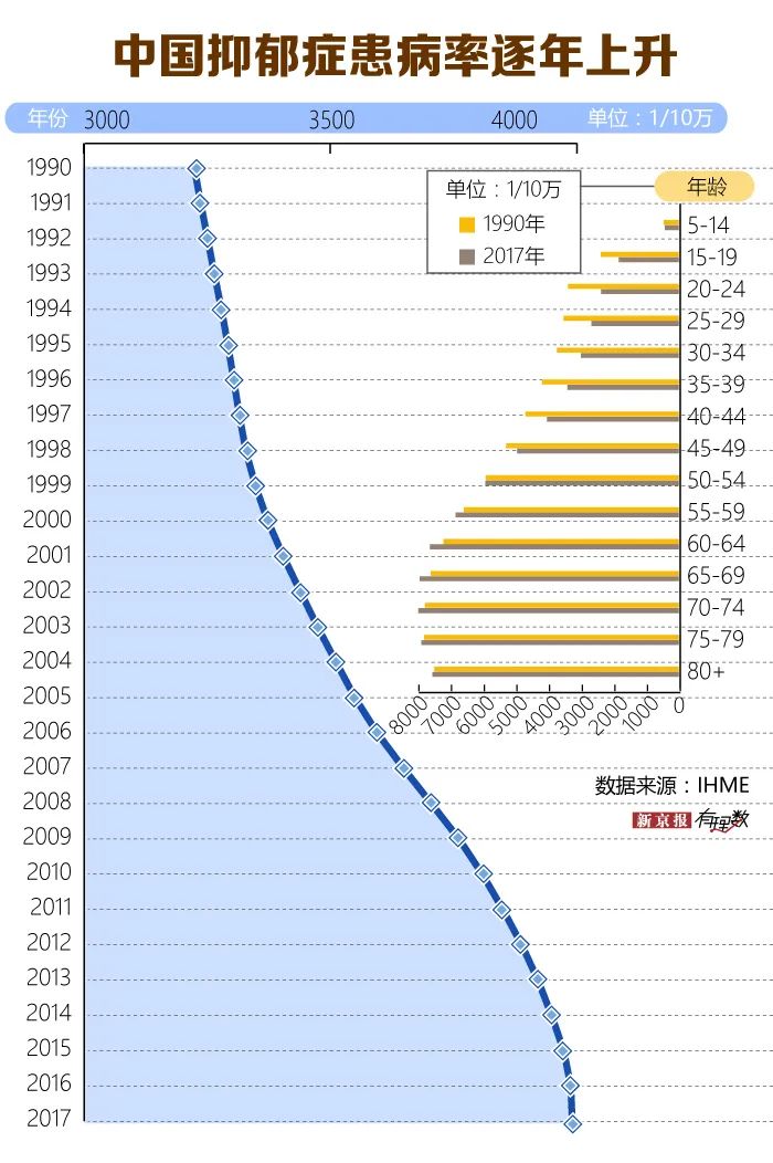 中国疾控中心周脉耕等人通过分析全球疾病负担2017年数据发现,中国的抑郁症已从1990年的全因残疾调整生命年(DALYs,从发病到死亡所损失的全部健康寿命年)的第15位上升到2017年的第10位。