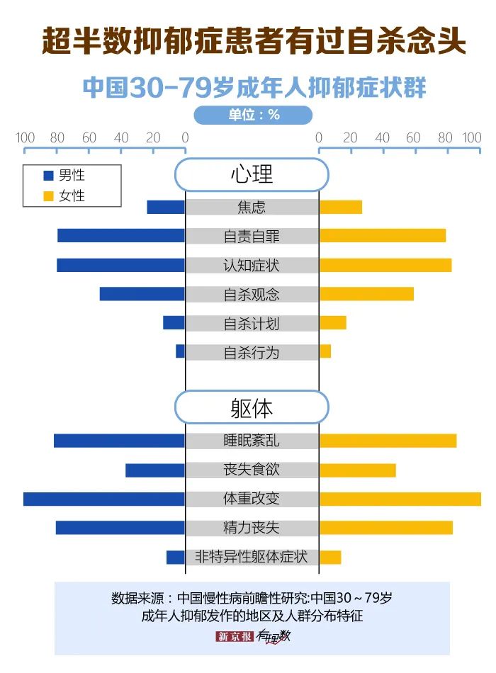 一项针对我国30-79岁成年人抑郁的研究显示,抑郁症的临床表现上,认知症状、自责自罪和自杀观念是较为常见的心理症状,出现的概率分别为80.81%、78.18%和56.51%;躯体症状群则以体重改变、睡眠紊乱和精力丧失较为常见,出现概率分别为99.91%、83.60%和81.59%。