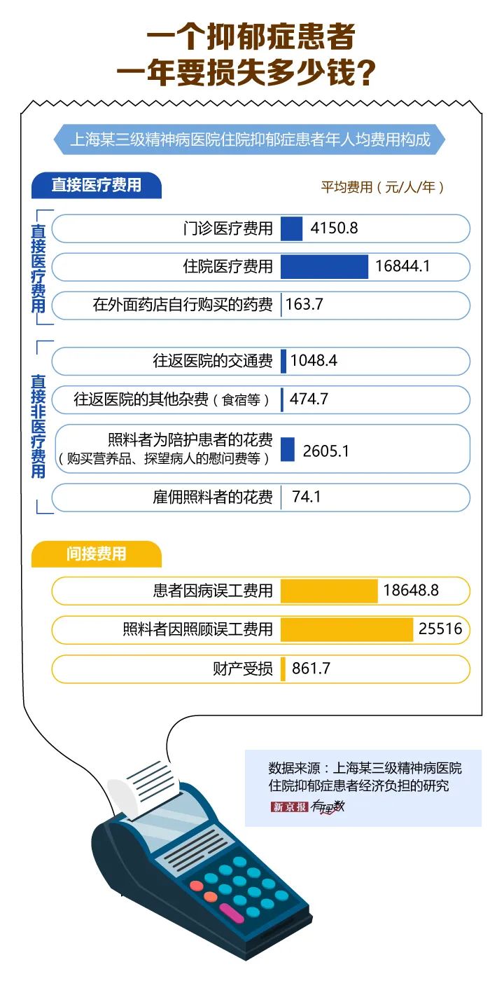 一篇发表在《国际药物经济学杂志》上的文章显示,中国每个抑郁症患者每年造成的直接经济损失为1000元-6000元,间接经济损失为2000元-51000元。