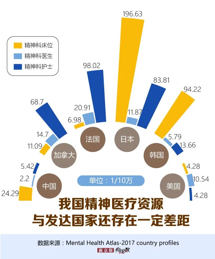 世界卫生组织发布的2017年《精神卫生地图集》显示,中国平均每万人仅拥有2.2名精神科医生、5.42名精神科护士。