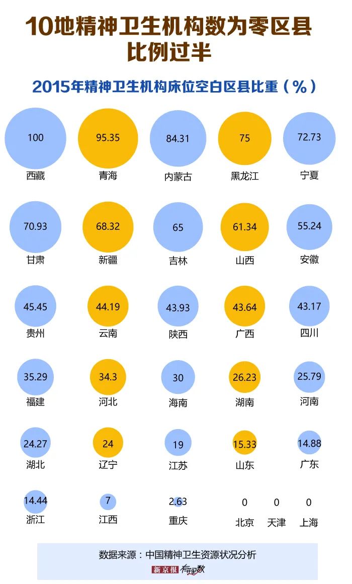 据一项针对中国精神卫生资源状况的分析,直到2015年底,全国2853个区县中,仍有1180个区县辖内精神卫生机构数量为零,1366个区县无精神科床位。其中,有10个省(区)精神卫生机构数量为零区县比例在50%以上。