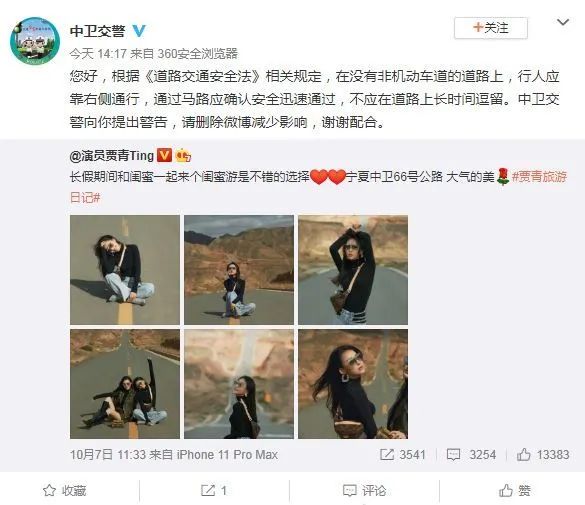 10月7日,贾青发微博晒出其与闺蜜在中卫66号公路中央拍的多张照片。中卫交警称,根据《道路交通安全法》相关规定,在没有非机动车道的道路上,行人应靠右侧通行。