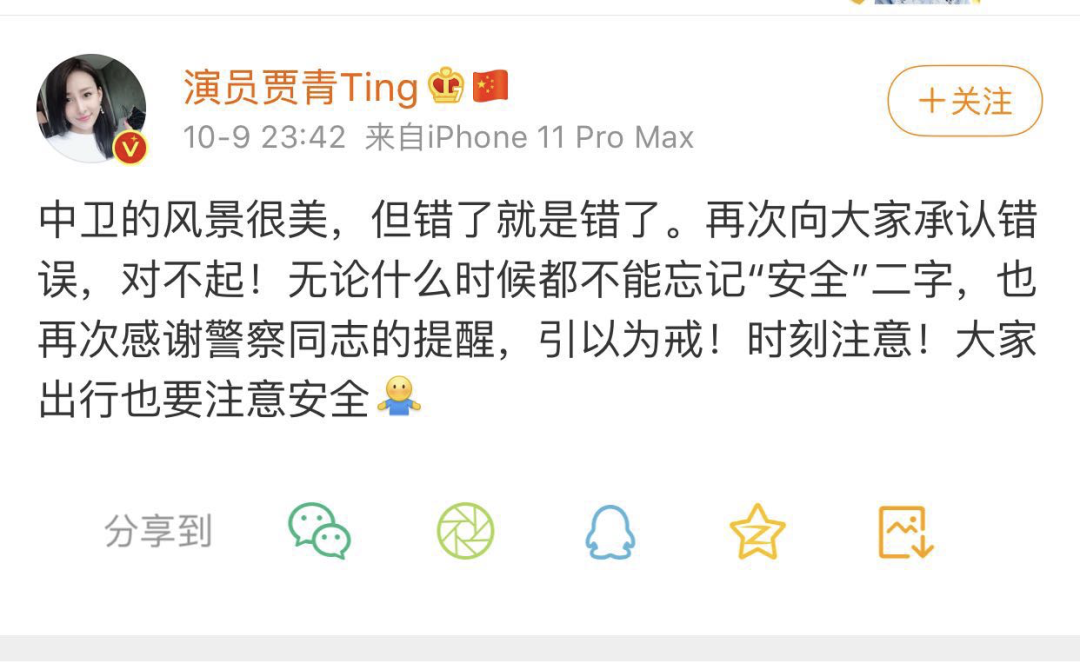 9日晚,贾青发文道歉,并按要求删除了微博。