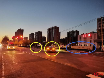 事故现场,黄圈处为发生车祸的汽车与摩托车,蓝圈处即为北湖医院入口。