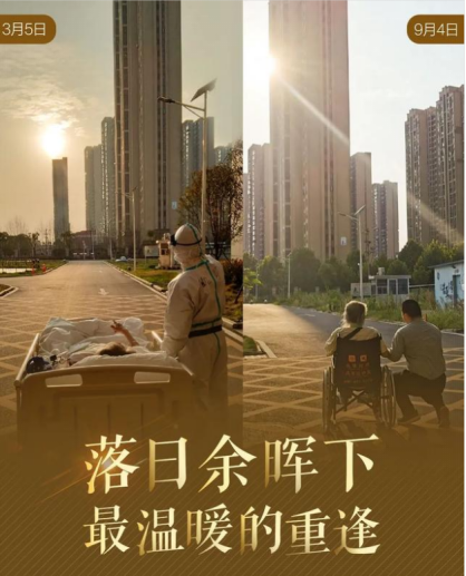 3月5日,武汉。援鄂医疗队队员刘凯医生护送病人途中,停下让已因新冠住院近一个月的87岁老人王欣欣赏了一次久违的日落。9月4日,照片中的两位主角再次在武汉大学人民医院东院重逢,携手再看夕阳。