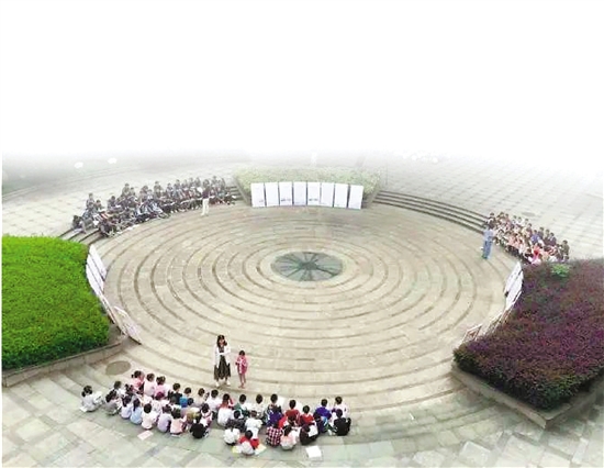记者在一张照片中看到,很多同学围着圆形操场席地而坐,手里拿着书本,聚精会神地看着老师。现场总共有四个班,其中个头小小的,是三个班的一年级萌娃;穿着校服个子高高的,是初一的大哥哥大姐姐。