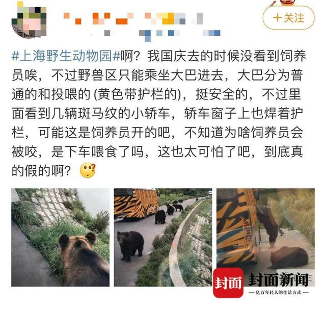 与此同时,记者在多个网络平台看到,有游客分享在上海野生动物园的游玩感受时提到,在猎豹区和熊区,投喂食物一般就是在大巴车内进行,游客曾看到过驾驶着斑马车的饲养员直接下车扔食物,最终也安全上车。