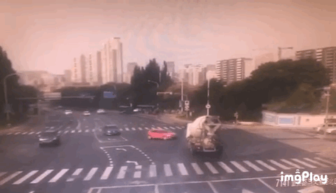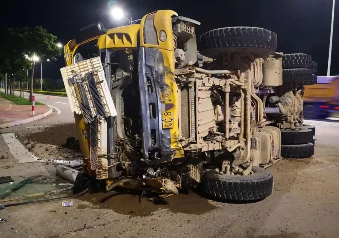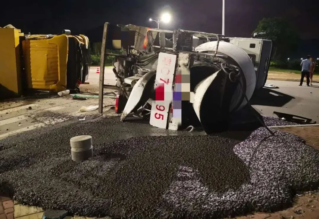 “嘭”的一声巨响,泥头车和搅拌车猛烈碰撞上了。瞬间两车分别向车身右侧方向翻侧,现场一下子沙尘滚滚,水泥也缓缓从搅拌桶中流出。