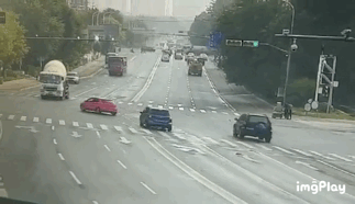 网上流传的视频显示,事发时红色轿车在左转车道,车辆在行驶至事发地点时对向直行的罐车行驶过来。