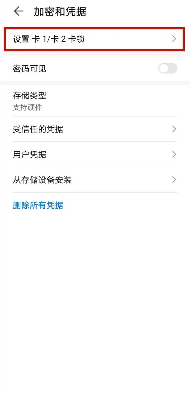 点击设置,选择安全选项——点击更多安全设置——选择加密和凭据——选择设置卡1/卡2锁——点击锁定SIM卡按钮——第一次设置密码时需先输入原始默认的PIN码(一般为“1234”)——输入个人四位密码后即设置成功。