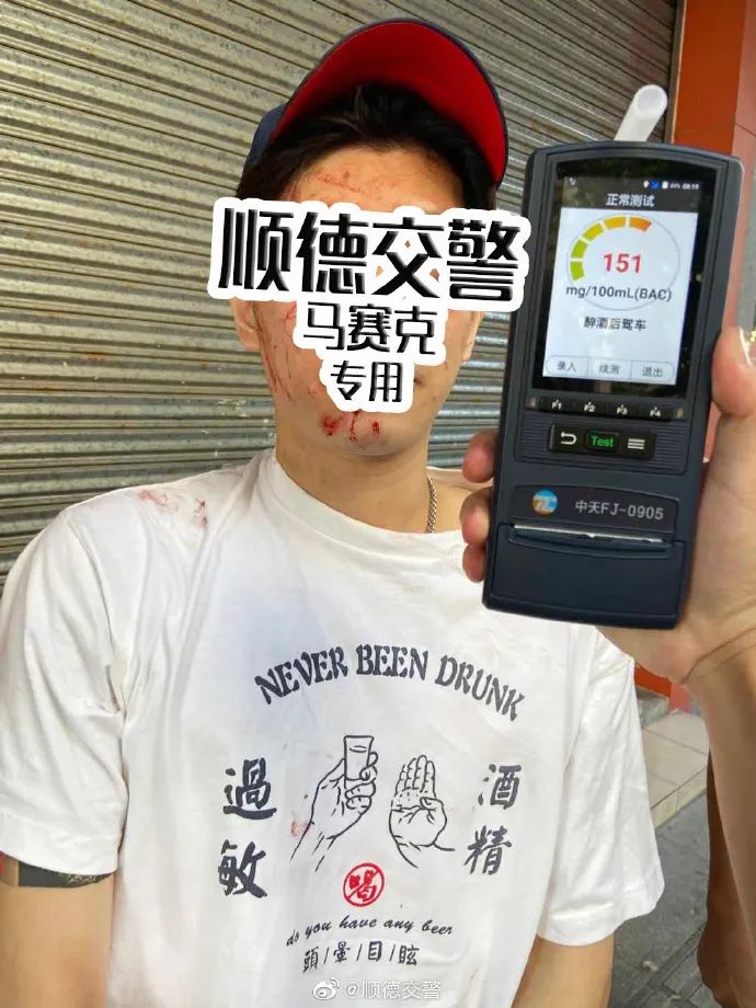 当日,佛山市顺德区公安局交警大队北滘中队民警接报称,一辆摩托车在南源路撞上路边的小汽车,怀疑摩托车驾驶员酒驾。民警到场后发现,一辆停在路边的小汽车左侧后车灯被撞,涉嫌肇事的摩托车停在小汽车旁。肇事男子额头上有一道约3cm的伤口,脸上也有数道伤痕。