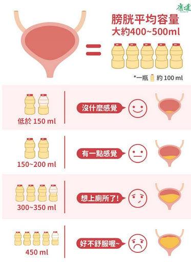 不过,当膀胱内储存300毫升左右的尿液时,我们就会产生尿意;当膀胱的尿液超过500毫升时,我们就会着急想上厕所;当膀胱中的尿液超过800毫升时,此时已经到达很多人的极限,很多人会因此而尿裤子。