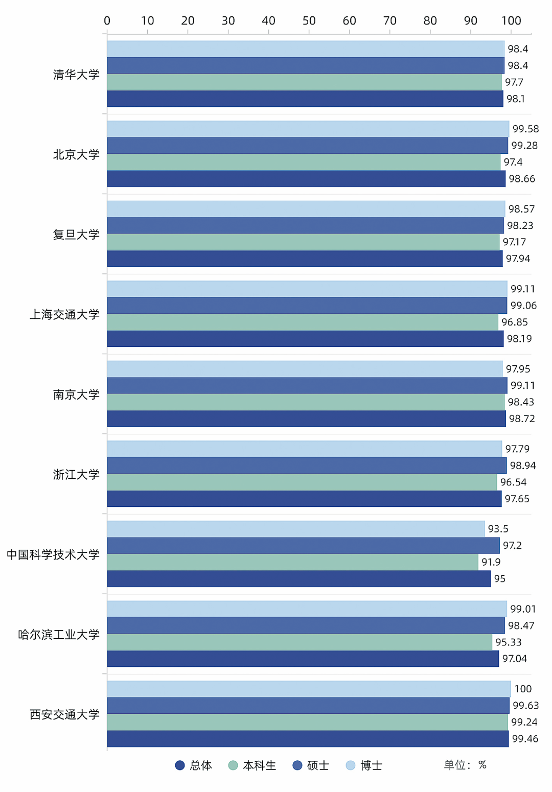 不过,南京大学成为个例,博士生就业率为97.95%,低于本科生和硕士生就业率。另外,除中国科大、浙大博士生就业率略低于硕士生就业率外,其他高校博士生就业率均为最高。