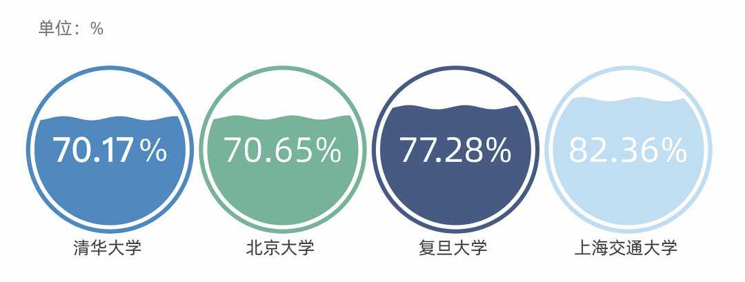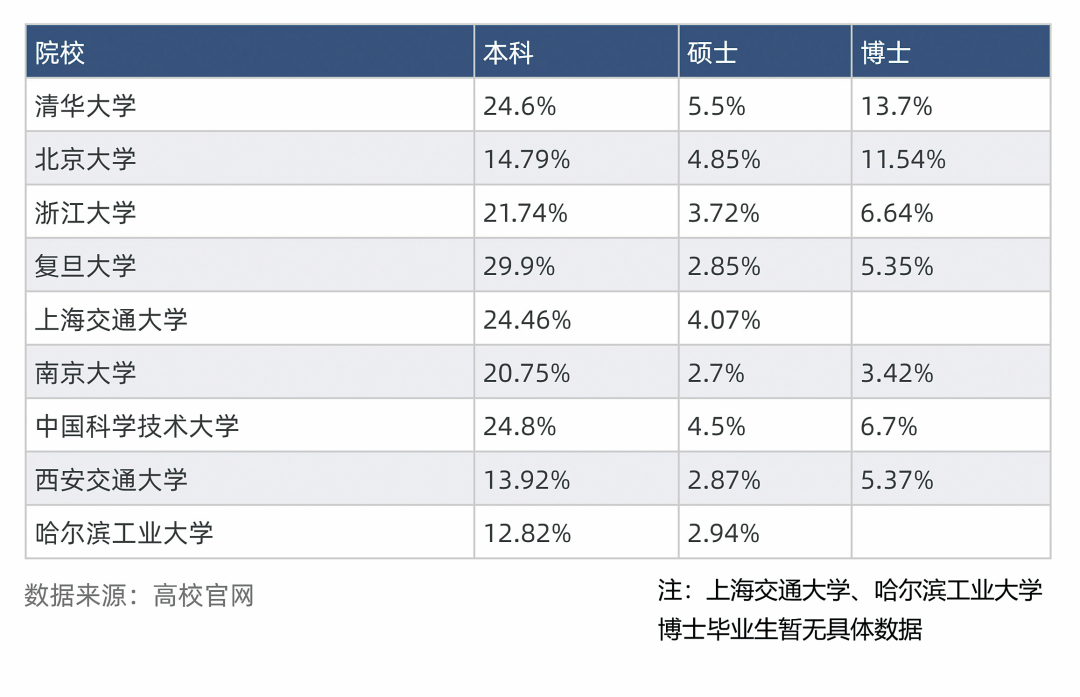 以清华大学为例看高校毕业生国内深造率,纵向来看可以发现,本科生的国内深造率最高,其次是博士生,硕士生最低;横向来看,无论是本科生、硕士生还是博士生,其深造比例整体都呈现逐年上升的趋势,这意味着近年来更多学生在毕业时选择“深造”这一方式。