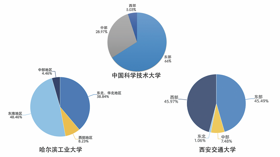 图3.中国科大、哈工大、西安交大2019届毕业生就业地区分布