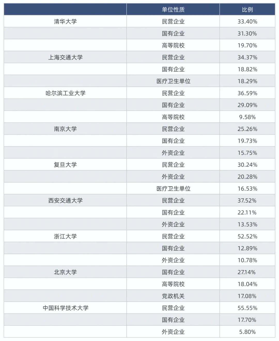而除去北京大学和复旦大学,在其他7所高校中,国有企业均占比第二。