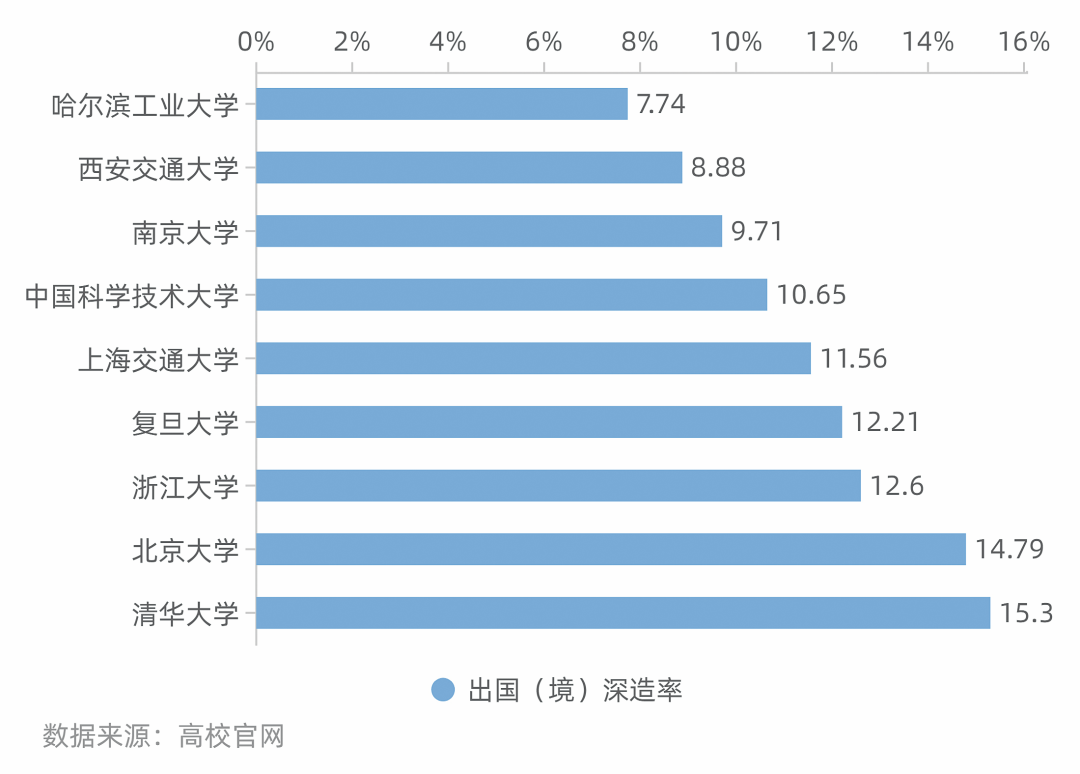 以清华大学为例,其2019届本科生出国(境)深造率为24.6%,相比2018届本科毕业生的26.3%下降了1.7个百分点。这在一定程度上说明,国内的高校实力、教学水平、学习平台都在不断进步,更多学生愿意留在国内进行学习深造。