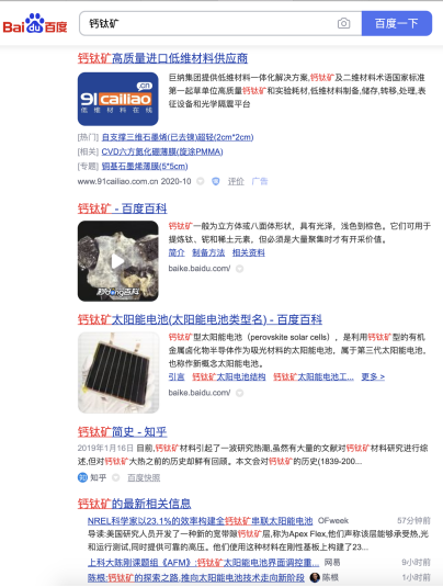 深思熟虑了一下,钙钛矿不是perovskite么?那个深居地下的东西,怎么也会出来晒太阳?于是乎,小编在度娘里搜了一下“钙钛矿”。发现除去没有必要的广告(广告也是太阳能电池的),“钙钛矿太阳能电池(太阳能电池类型名)-百度百科”紧随其后,还有各种相关的科研报道。