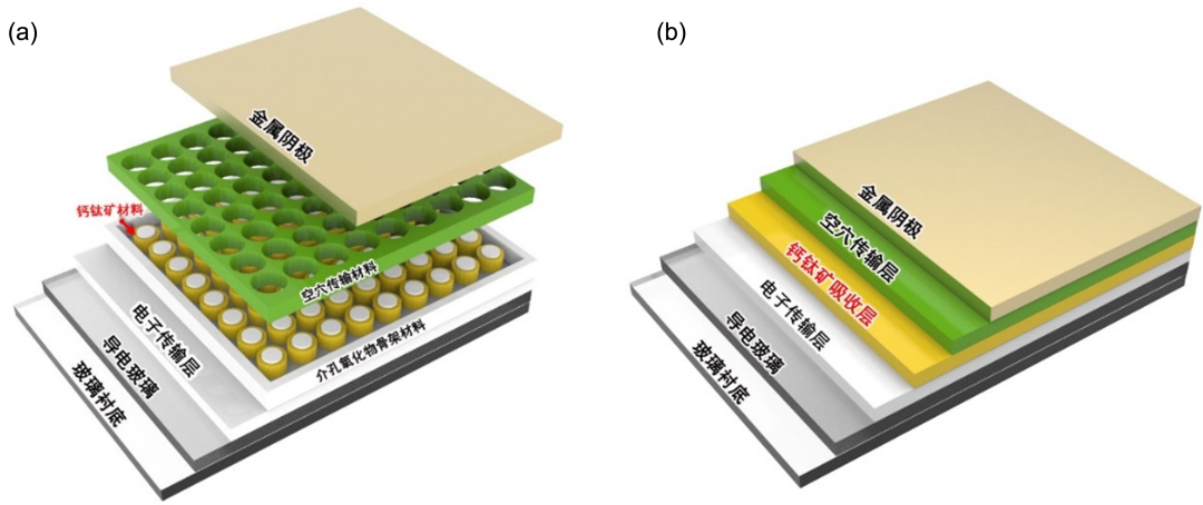 两种典型的钙钛矿太阳能电池的结构示意图(图片来源:参考文献3):(a)介观结构钙钛矿太阳能电池;(b)平面异质结构钙钛矿太阳能电池。
