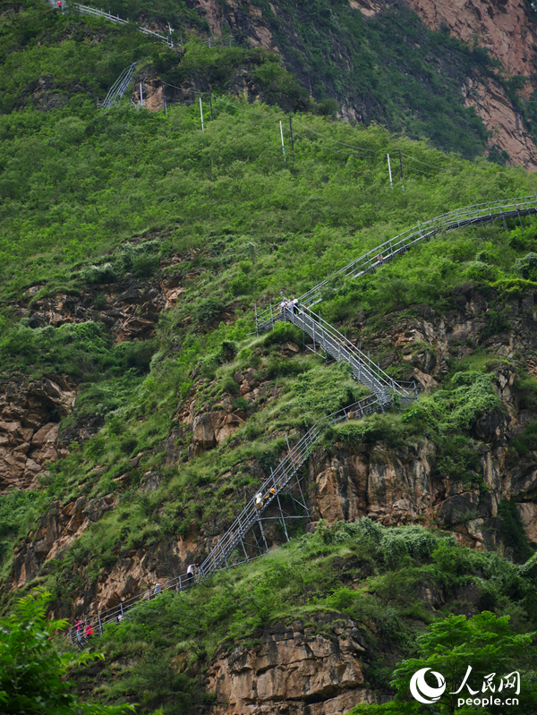 从山脚下仰望“悬崖村”钢梯。人民网记者 彭博摄