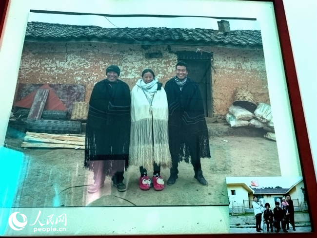 彝海村村民阿说瓦格的全家福,大幅背景是旧房,右下角背景是新居。人民网 高红霞翻拍
