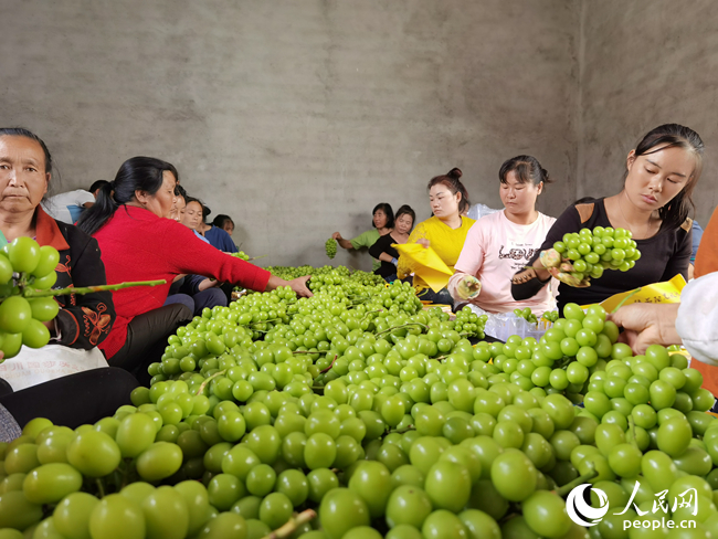 葡萄园内村民们正在分拣成熟的阳光玫瑰葡萄。人民网 王洪江摄