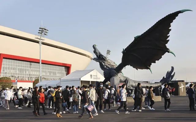 会场外,很多无法入场的粉丝依然早早赶到上汽浦东足球场,带着LPL专属定制口罩,拿着应援旗,和英雄联盟标志性雕塑远距离合影。