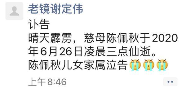 谢稚柳与陈佩秋之子谢定伟今天上午8点46分在朋友圈发布讣告。他悲痛地表示,上午8点他刚从医院赶回家中,今天凌晨母亲的意外辞世实属突然。疫情以来,她闭门不出,也不接待任何宾客,近期身体状况良好,也经常进行创作。