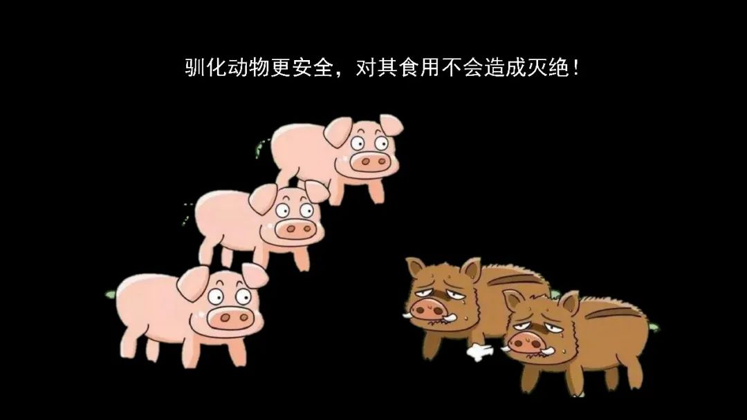 最关键的一点,这些驯化的动物,它可以实现大规模的繁殖、工厂化养殖,对其食用不会对其造成灭绝,我不会把它吃绝。