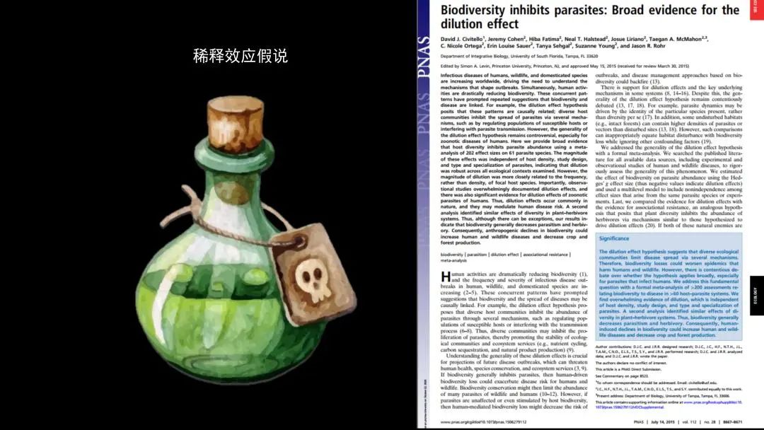 在美国《PNAS》上发表的一篇经典的文章就讲,生物多样性增加,有利于降低疾病的传播,它是符合生态学上一个经典的假说,叫稀释效应。