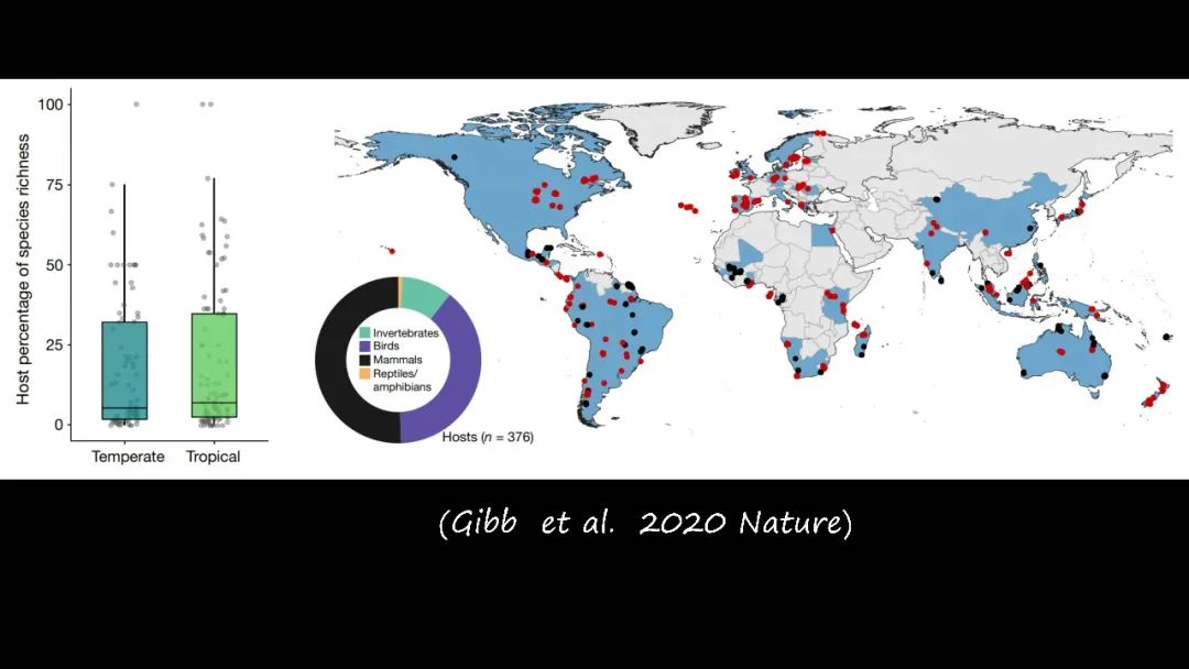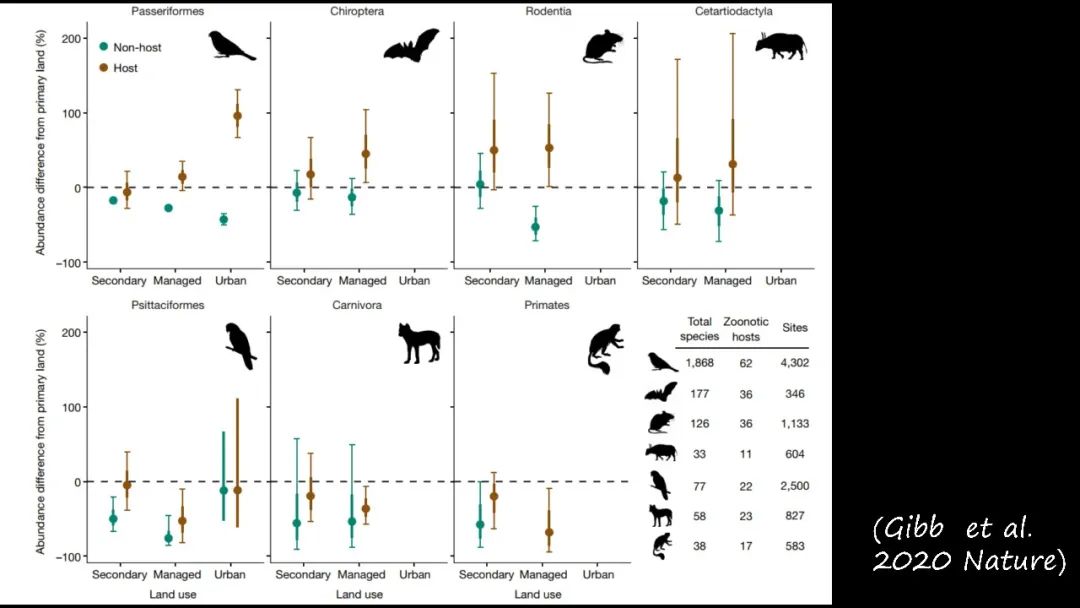 比如说随着人类活动密集的地方,一些容易携带寄生虫的这些动物,它们的数量就会增加;而不易携带寄生虫这些动物的类群,它就会减少。