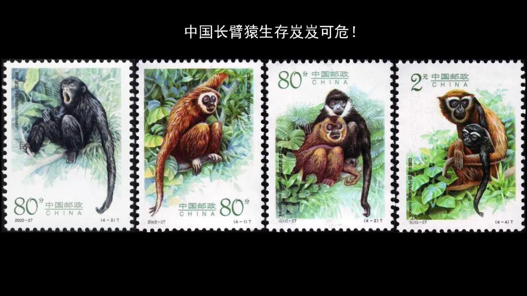 在我上初中的时候,2002年,中国邮局发了一套长臂猿的邮票,有黑冠长臂猿、有白眉长臂猿、白掌长臂猿、白颊长臂猿。如今中国的长臂猿已经岌岌可危了,像东黑冠长臂猿与海南长臂猿,它们的数量就在几十只左右,离灭绝就差一步;数量最多的西黑冠长臂猿,它也仅仅在1000只左右。我们知道长臂猿主要以果实为主,它生活在原始森林当中,它对森林里的更替起到很重要的作用。