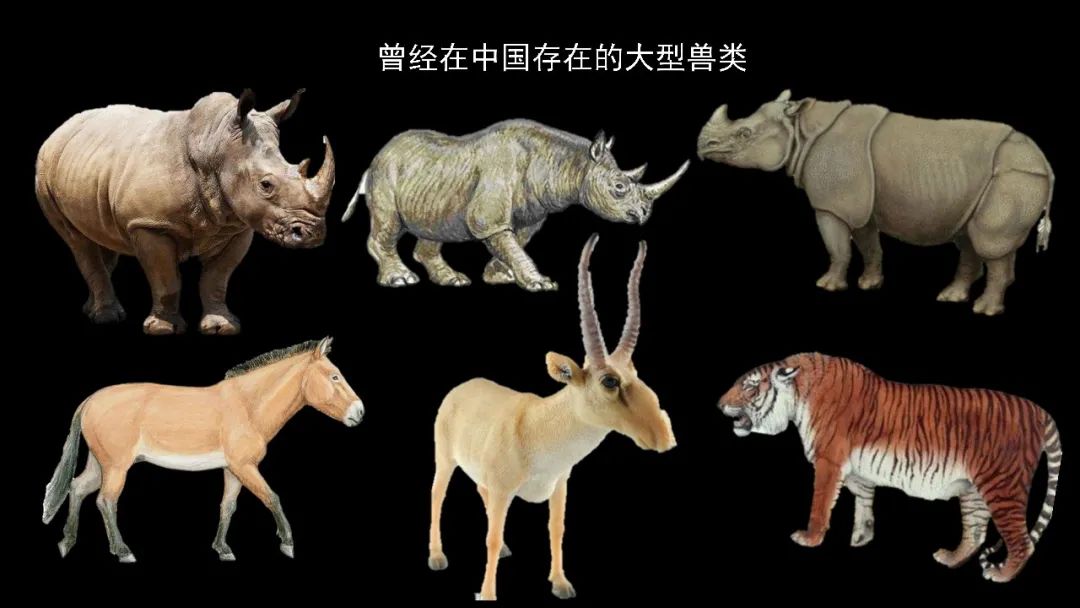 照片上这六种大型的动物,包括三种犀牛、普氏野马、高鼻羚羊、新疆虎,这都曾经生活在中国的大地上,也就在近百年左右,全部灭绝,全部从地球上消失。