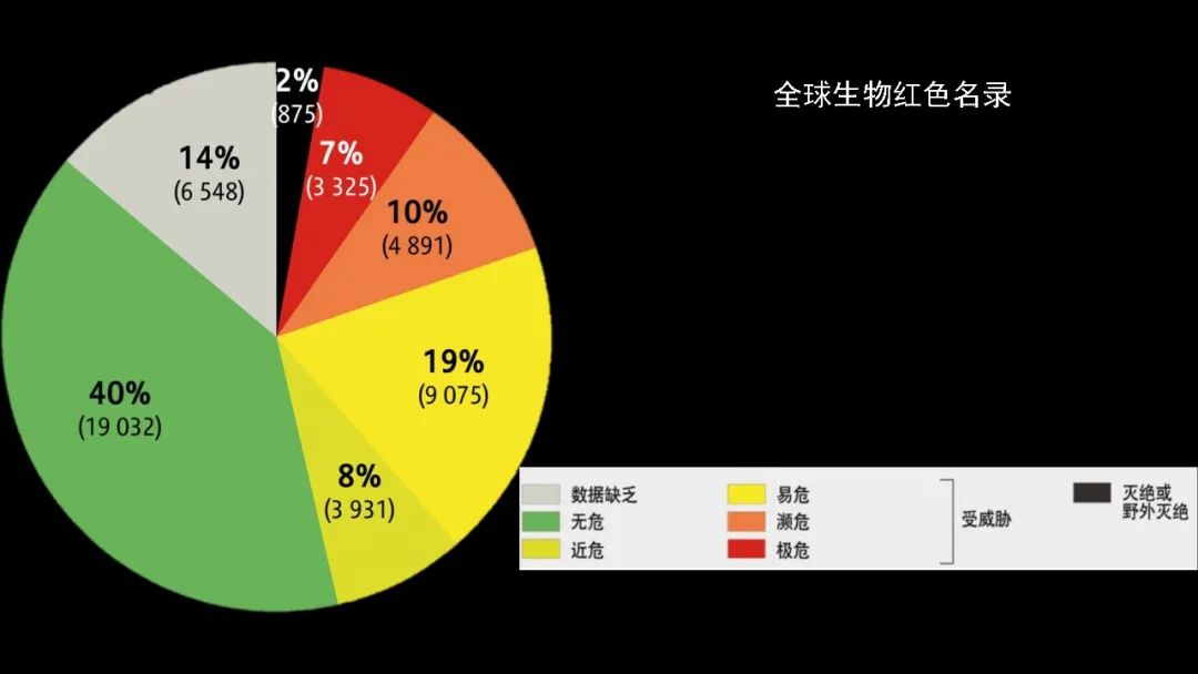 同样全球的形势依旧很严峻。全球大概38%的物种受到威胁,这黄色、红色和黑色的(部分)都是受到威胁的。