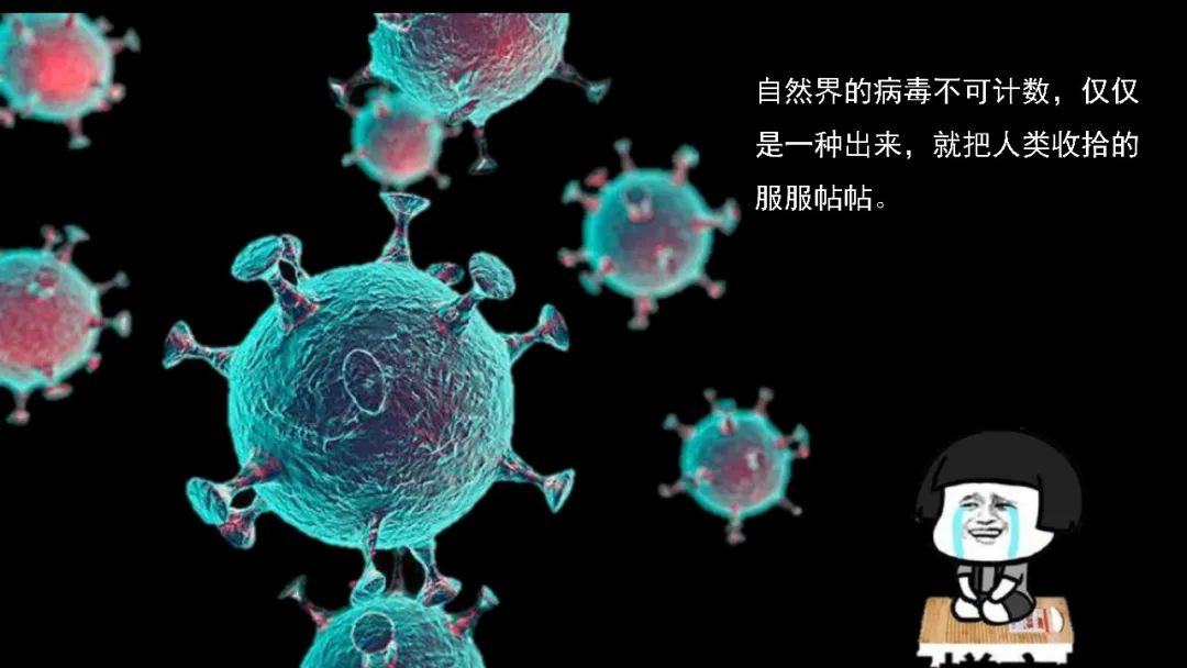 我们看自然界的病毒其实不可计数,何止几百万,不可计数,但是我们有没有想过,仅仅是这一种新冠病毒出来之后,就把世界给搅得鸡犬不宁,下至平民,上至美国总统,在病毒面前一视平等,大家没有例外。
