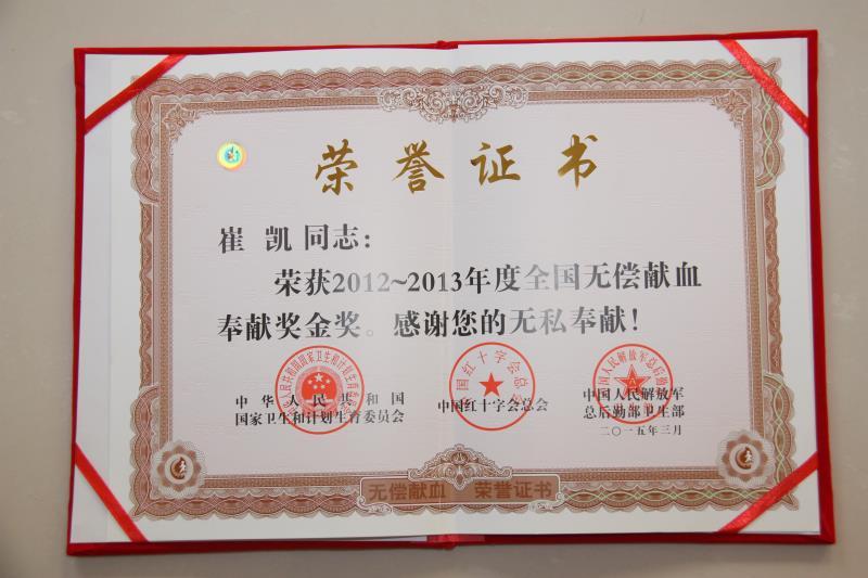 大爱无言。2010年以来,因医疗需要,国家开始要求献血者捐献成分血(捐献成分血就是指健康公民在献血过程中,通过血液分离机捐献血液中某一成分后,而其他成分及时还输给献血者的无偿志愿献血行为),崔凯已经两次参加了捐献成分血活动,成为献血者中为数不多者,他的义举为许多人解除了病痛,带来了健康。